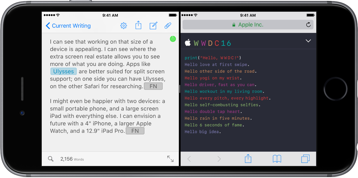 I can see that working on that size of a device is appealing. I can see where the extra screen real estate allows you to see more of what you are doing. Apps like Ulysses are better suited for split screen support; on one side you can have Ulysses, on the other Safari for researching.[^2]