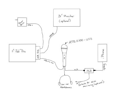 Here's how my setup is all connected, using my iPad Pro 2018 and my iPhone Xs.[1] First, I start with the power: I recommend using this Anker wall-charger, which provides a Power Delivery USB-C port along with a USB-A quick charge. I use it all the time for travel, and it's perfect for what I need. I use a USB-C to USB-C to power the iPad. Next, I connect the USB microphone cable to the iPad Pro using the Satechi hub;[2] this also allows me to use the HDMI for an external monitor and the USB-C port to power everything. Then, I connect the Røde iXLR to the end of the cable which comes with the microphone, and plug that into my iPhone directly. Finally, I connect the over-the-ear headphones to the the Røde iXLR and do a test recording to dial in the sound level for the environment. When I have that part set and I'm happy with the audio, I'll connect the monitors directly to the back of the microphone so I can use them for the audio call; I can monitor the sound visually using Røde Reporter or Ferrite. I prefer using Ferrite due to the smaller file sizes and better recording controls for volume as well as the ability to bookmark the audio when topic change and/or I cough; it helps me in the edit later. However, I have noticed that using the configuration menu in Røde Reporter allows me to use a -20 dB pad for the mic, resulting in quieter background noise and an overall better sound.